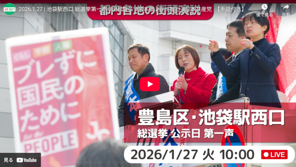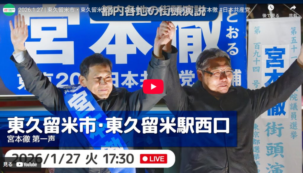 2026年1月27日 日々の活動 宮本徹 総選挙政策の訴え(要旨) ● 徹頭徹尾、高市首相の自己都合、党利党略解散ですが、選挙は政治を変える絶好の機会です。国民の願いが届く政治へ変えるため、議席奪還へ全力で頑張ります。 政治は国民の幸せのためにあります。物価高から、本気で暮らしを守り抜く […]